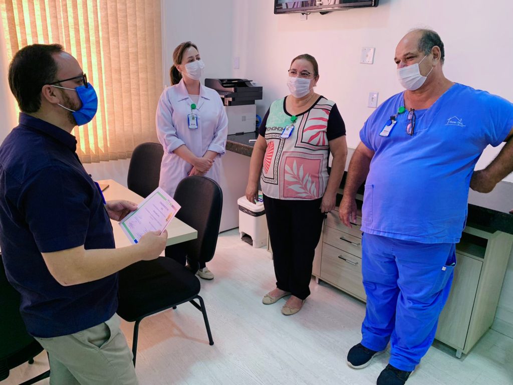 A diretora Administrativa e Financeira, Eunice Masson; a diretora Assistencial, Bruna Perassoli Teixeira; e a gestora de Recursos Humanos, Cláudia Janaina Figueira, também participaram do ato do anúncio do funcionário do ano e entrega do certificado.