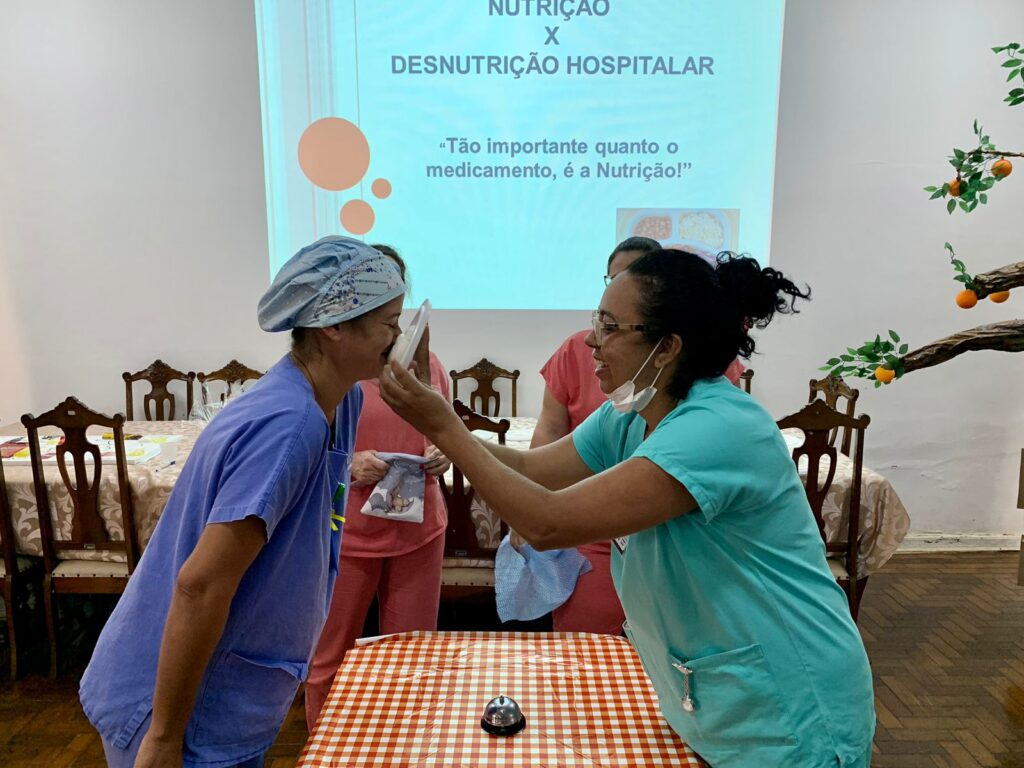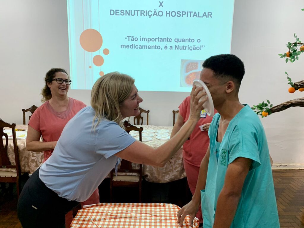 O terceiro dia da Semana foi marcado pelo jogo de torta na cara. Por meio de uma dinâmica de perguntas e respostas, as nutricionistas do setor de Nutrição e Dietética, Cláudia Slavez e Nathália Cury, conscientizaram os colaboradores sobre questões da Nutrição e Desnutrição Hospitalar dos pacientes.